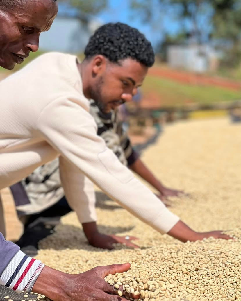 La estación de beneficio en Gerba Dogo procesa el café con rigurosidad: lavado estricto, secado en camas africanas, control de humedad, y limpieza final antes de la exportación. Lo que hacen, lo hacen muy bien.