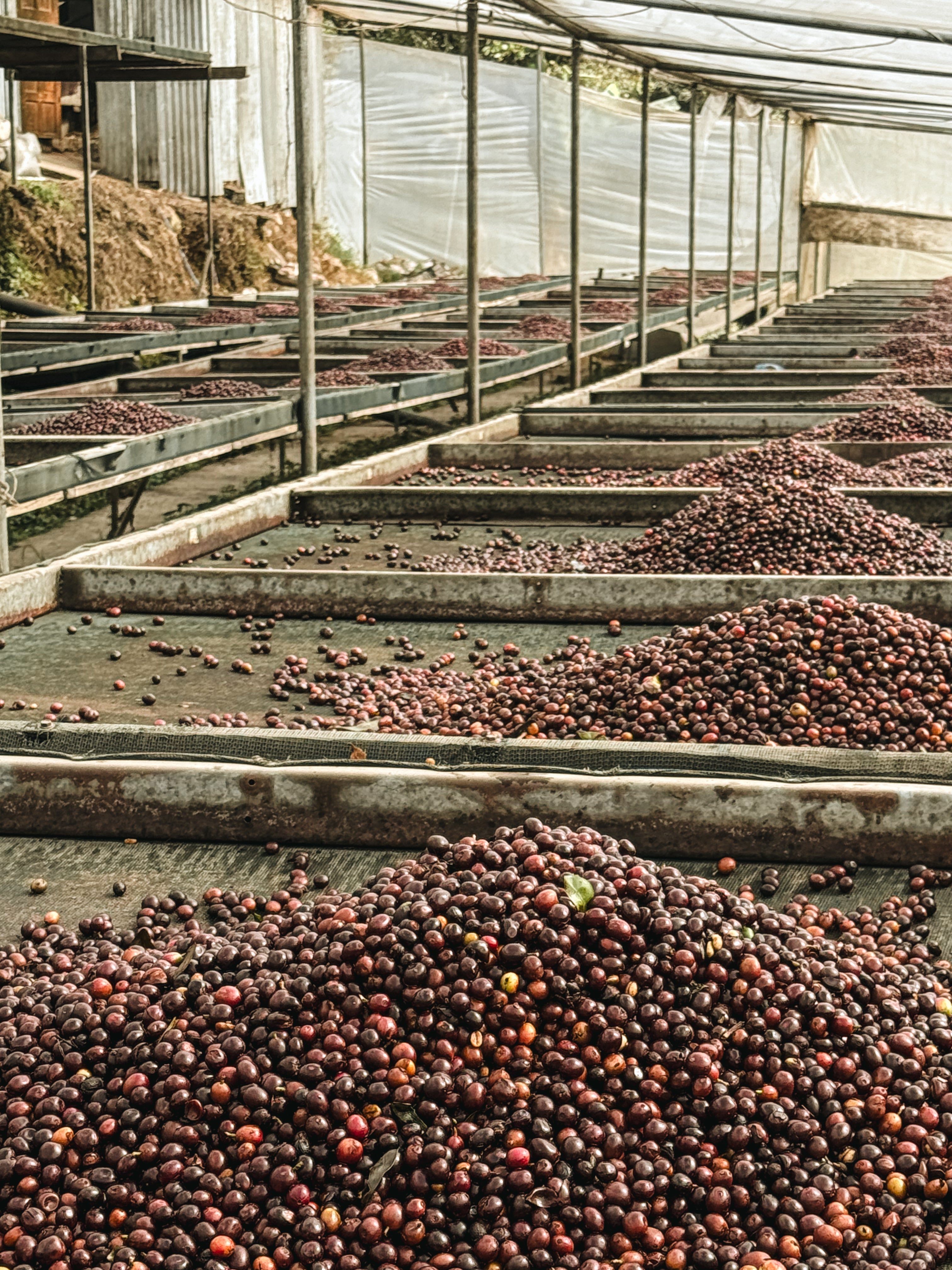 Se recolectan a mano solo las cerezas maduras y se colocan enteras en tanques herméticos sin oxígeno durante 12 horas. Allí comienza una fermentación controlada —anaeróbica— con la fruta rodeando el grano. Al no haber oxígeno, los microorganismos transforman azúcares y ácidos de forma distinta, aumentando la complejidad aromática. Después, las cerezas se sacan de los tanques para secarlas al sol en camas elevadas, donde se produce una segunda fermentación aeróbica que estabiliza y fija los compuestos desarrollados.